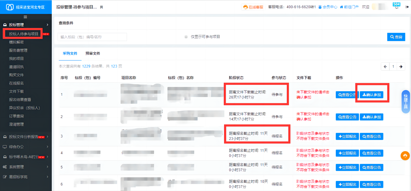 (1)【待参与】可以直接进行下载文件,点击后方【确认参加】即可下载招标文件;