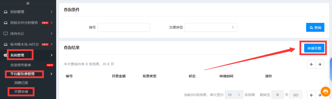 1、平台服务费开票路径:【系统管理】-【平台服务费管理】-【开票申请】-【申请开票】